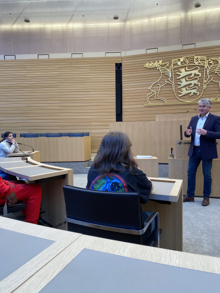 Nach rund einer Stunde ging es weiter in einen Konferenzraum der Fraktionen. Dort wurde der Austausch vertieft, unter anderem zu wirtschaftlichen Themen, aber auch zu Fragen, die weit über die Grenzen Baden-Württembergs hinausgehen. So fragten die Jugendlichen beispielsweise: „Wie schätzen Sie die Lage in Minneapolis ein?“ oder „Was können wir hier in Baden-Württemberg tun, damit unsere Technologien nicht von anderen Staaten gestohlen werden?“.