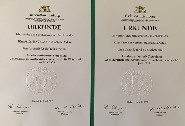 Jeweils 100,- Euro Preisgeld für ihre Klassenkassen haben die Klassen 10a und 10b der Uhland-Realschule beim diesjährigen Landeswettbewerb Tierschutz „Schülerinnen und Schüler machen sich für Tiere stark“ gewonnen. Gemeinsam mit ihrem Fachlehrer Gunnar Birzele setzten sie sich mit der Fragestellung, wie man konkret den Tierschutz fördern kann, im Rahmen des Geographieunterrichts auseinander. Dabei befassten sich die Abschlussschülerinnen und -schüler mit dem Thema Tierschutz in der Europäischen Union und erstellten sehenswerte Präsentationen.