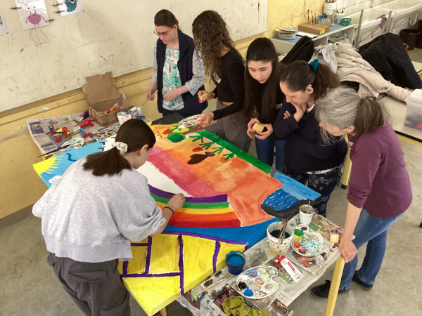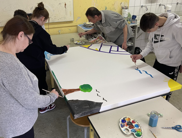 Die Kunstgruppe der Samariterstiftung mit ihrer Kunsttherapeutin Frau Werner besuchte hierfür die Schülerinnen und Schüler der Klasse 8a mit ihrer Lehrerin Sibylle Abele im Unterricht. An jeweils zwei Donnerstagen im April wurde gemeinsam die Leinwand im Großformat zum Thema: „Hindernisse im Alltag“ gestaltet.