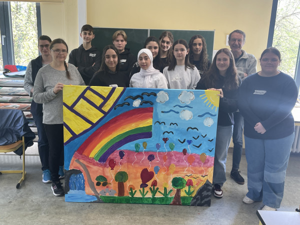 Luftballone, einen Regenbogen, Blumen, ... das zierte die XXL- Leinwand, die anlässlich der Aktion der Stadt Aalen „Gleichstellung von Menschen mit Behinderung - Inklusionsartig“, in der Uhland-Realschule entstanden ist.