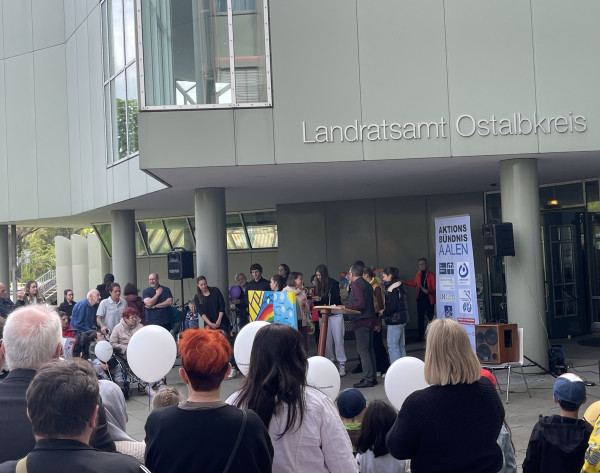 Ein weiteres Highlight war schließlich die Kundgebung am Freitag, den 05.05.23, vor dem Landratsamt in Aalen. Gemeinsam und voller Stolz präsentierte die Gruppe ihr entstandenes Werk.
