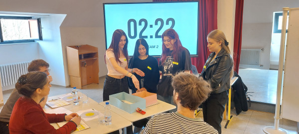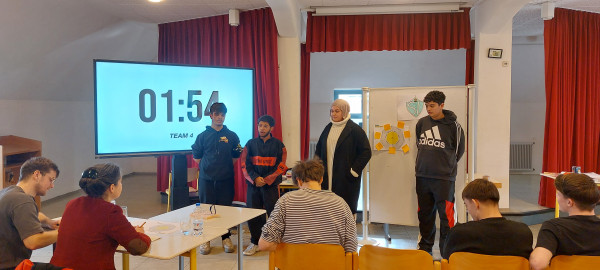 Vor der Siegerehrung zog sich die Jury zurück und stand vor einer schweren Entscheidung. Auch bei den Kleingruppen der Klasse 9c stieg die Spannung, schließlich hatten alle viel Herzblut und Hirnschmalz in ihre Projekte gesteckt. Dass auf die erstplatzierte Gruppe ein Preisgeld von 100,- Euro wartete, wurde dabei fast vergessen. Am späten Nachmittag waren nach der Siegerehrung alle Gruppen stolz auf ihre Leistungen. An einem langen aber kurzweiligen Tag wurde konzentriert gearbeitet und am Ende standen tolle Ergebnisse, die in souveränen Pitches präsentiert wurden. Die Schülerinnen und Schüler bekamen für sie neue, wertvolle Einblicke in die Vorgehensweise der Gründerszene. Die Klasse 9c ist stolz auf ihre Erfindungen und vor allem auf die Wertschätzung von Levin, Max und den Juroren, die ihr Fachwissen auf Augenhöhe, wie mit Kollegen teilten.