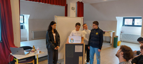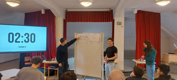 Am Nachmittag wurde es dann ernst und die Schülerinnen und Schüler durften ihre Erfindungen vor einer professionellen und sachkundigen Jury präsentieren. Diese bestand aus der Aalener Architektin und Gründerin Kirsten Petra Seydelmann sowie Tim Hellwig, der als Company Builder Startups berät und eigens aus Stuttgart angereist war. Im sogenannten Pitch hatten unsere neuen Lichter am Gründerhimmel je drei Minuten Zeit, alle Vorzüge ihrer Erfindungen vorzustellen. Danach oblag es in weiteren drei Minuten den Juroren, kritisch die Tauglichkeit der Geschäftsideen zu hinterfragen.