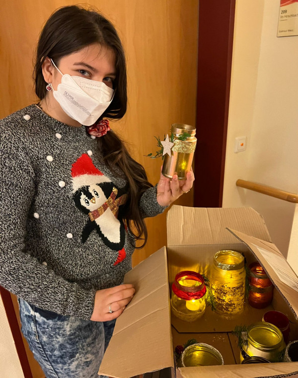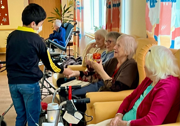 Die Schülerinnen und Schüler brachten nicht nur für jeden der Bewohner ein von der Klasse 7c der Uhland-Realschule selbstgebasteltes, weihnachtliches Windlicht, sondern nach zwei schweren und entbehrungsreichen Jahren auch viel Freude in die Herzen der dort wohnenden Damen und Herren und auch in die der Mitarbeiterinnen und Mitarbeiter.