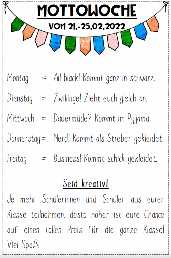Am Montag starteten wir mit dem Thema „All Black! Kommt ganz in schwarz“. Da viele unserer Schülerinnen und Schüler gerne schwarz tragen, war an diesem Tag die Teilnahme am höchsten und alle Klassen konnten mit vielen Punkten in die Woche starten.