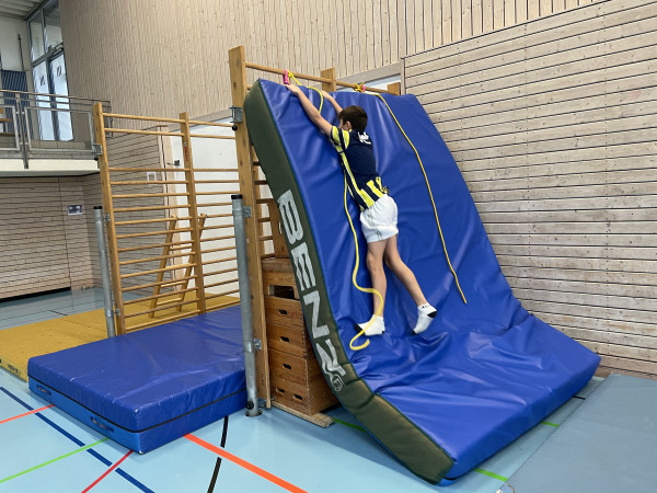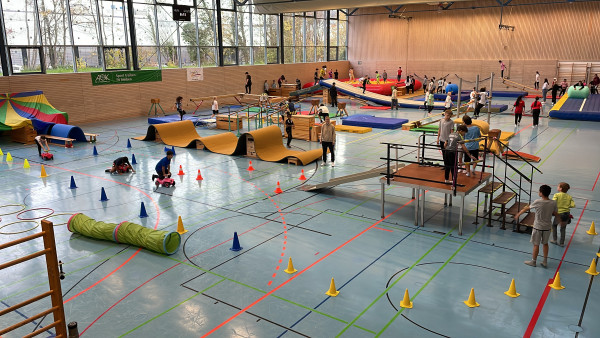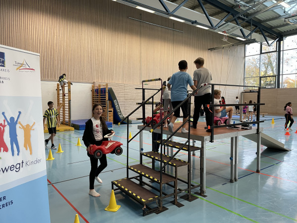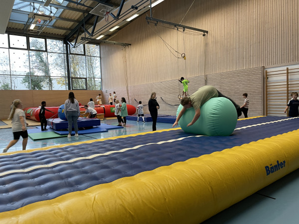 Ob Runterfahren der Bobby-Car-Rampe, Klettern und Hangeln durch aufregende Parcours oder das gemeinsame Hüpfen auf dem riesigen Hüpfkissen - die Schülerinnen und Schüler der 5. und 6. Klassenstufe hatten eine ganze Menge Spaß. Anstelle des regulären Sportunterrichts durften sich die Schülerinnen und Schüler 90 Minuten lang nach Belieben austoben und dabei verschiedene Stationen erkunden und ausprobieren.