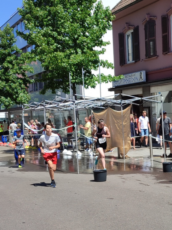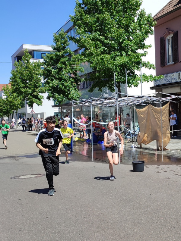 Trotz der sehr hohen Temperaturen erzielten unsere Schülerinnen und Schüler sehr gute Leistungen, denn die kühle Dusche kurz vor dem Ziel gab den letzten Turbo.