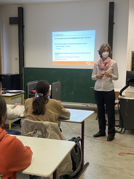 Außerdem ging es um (Cyber-)mobbinghandlungen wie Beleidigungen, Bedrohungen, üble Nachrede, Identitätsdiebstahl und Erpressungen. Die erfahrene Rechtsanwältin und Mediatorin erläuterte den Schülerinnen und Schülern, dass diese Handlungen für den bzw. die Täter strafrechtliche Folgen sowie einen Eintrag ins polizeiliche Führungszeugnis zur Folge haben können oder eventuell Schadensersatz an das Opfer gezahlt werden muss.